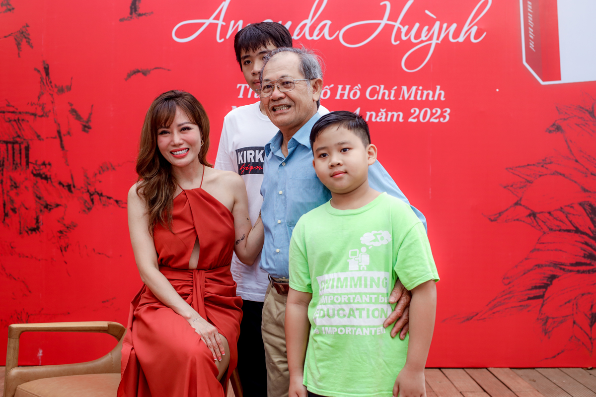 Trở về sau bao năm xa rời Sài Gòn yêu dấu, Amanda Huỳnh chọn cho mình chiếc đầm cổ yếm màu đỏ mảnh mai khoe khéo đôi vai gầy gợi cảm và đôi chân thon thả. Vẻ đẹp dịu dàng của nữ nhà văn được tô điểm thêm bởi mái tóc xoăn gợn sóng và lớp trang điểm nhẹ nhàng như những phụ nữ Pháp.