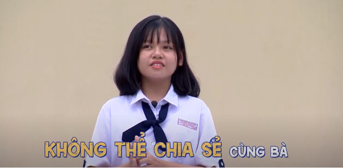 “Thông qua chương trình, mình muốn gửi lời cảm ơn đến ngoại. Cảm ơn ngoại đã nuôi nấng con trong suốt 18 năm, từ nhỏ đến lớn. Con cũng muốn gửi lời xin lỗi tới ngoại, vì từ trước đến giờ con rất ngại nói những điều thế này. Hôm nay, thông qua chương trình con muốn gửi lời xin lỗi đến ngoại vì những lần con làm sai, những lần con không kiềm chế được cảm xúc đã tạo ra khoảng cách giữa con và ngoại. Con cũng hy vọng, sau hôm nay ngoại sẽ hiểu và lắng nghe con nhiều hơn”.